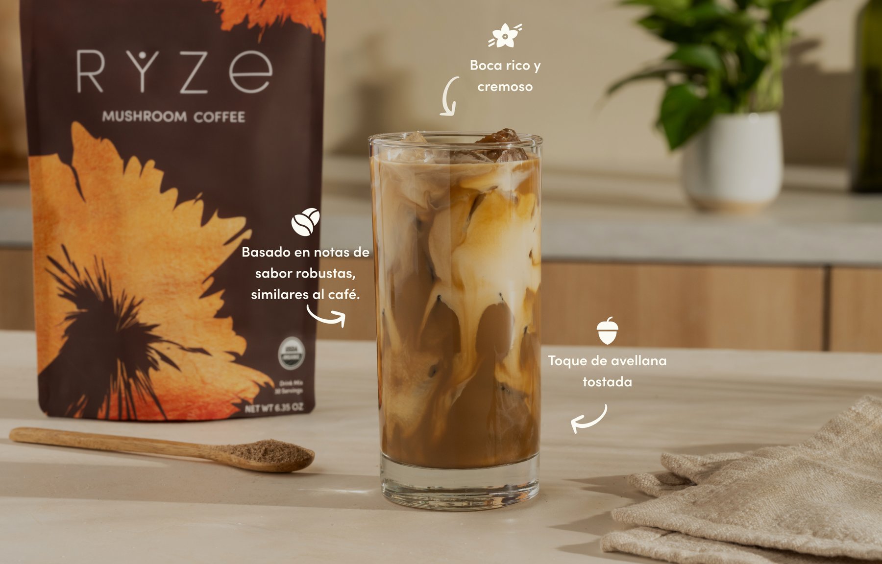 Beneficios. Beneficios. Beneficios. Con menos de la mitad de la cantidad de cafeína que el café normal, el café de hongos ofrece una gran cantidad de beneficios para la salud, tales como enfoque y atención, energía sostenida sin nerviosismo, apoyo inmunológico, salud intestinal y un aparato digestivo tranquilo que promueve la desinflamación abdominal. Además, los hongos adaptógenos son superalimentos y ofrecen beneficios para optimizar el cuerpo y el cerebro, ya que son antioxidantes, antivirales y antimicrobianos.